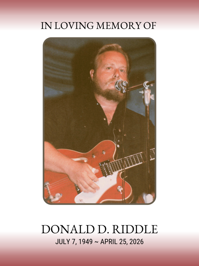 The family of Donald Dean Riddle is deeply saddened to announce his passing on April 25, 2026. Born on July 7, 1949 in Kansas City, MO, Don lived a full and remarkable life. He touched the hearts of everyone he met through his singing and guitar playing, along with his ability to put a smile on anyone’s face. Don was greeted at heaven’s gates by his parents, Jess and Christine (Wolf) Riddle, and brothers, James Riddle, Bill Riddle, Robert Riddle and Joe Riddle.