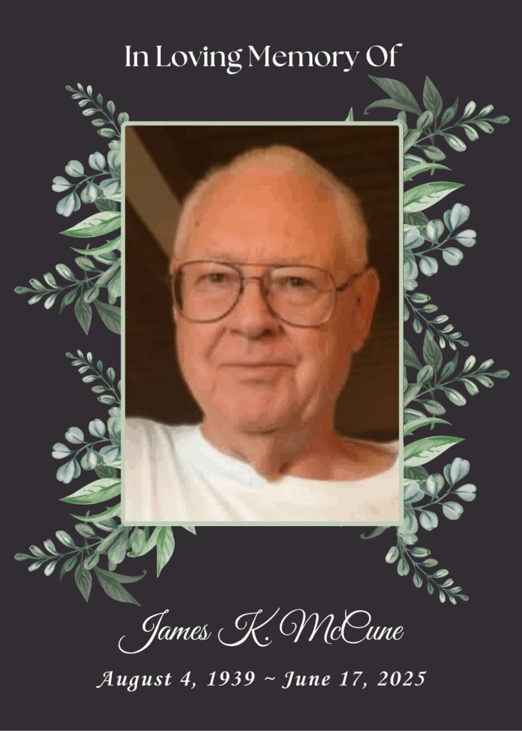 James (Jim) K. McCune of Sedalia, Missouri passed away peacefully Tuesday, June 17, 2025 in hospice care. Graveside service and burial will be at 10 a.m., Monday, June 23, 2025 at New Salem Cemetery in Independence, Missouri.
