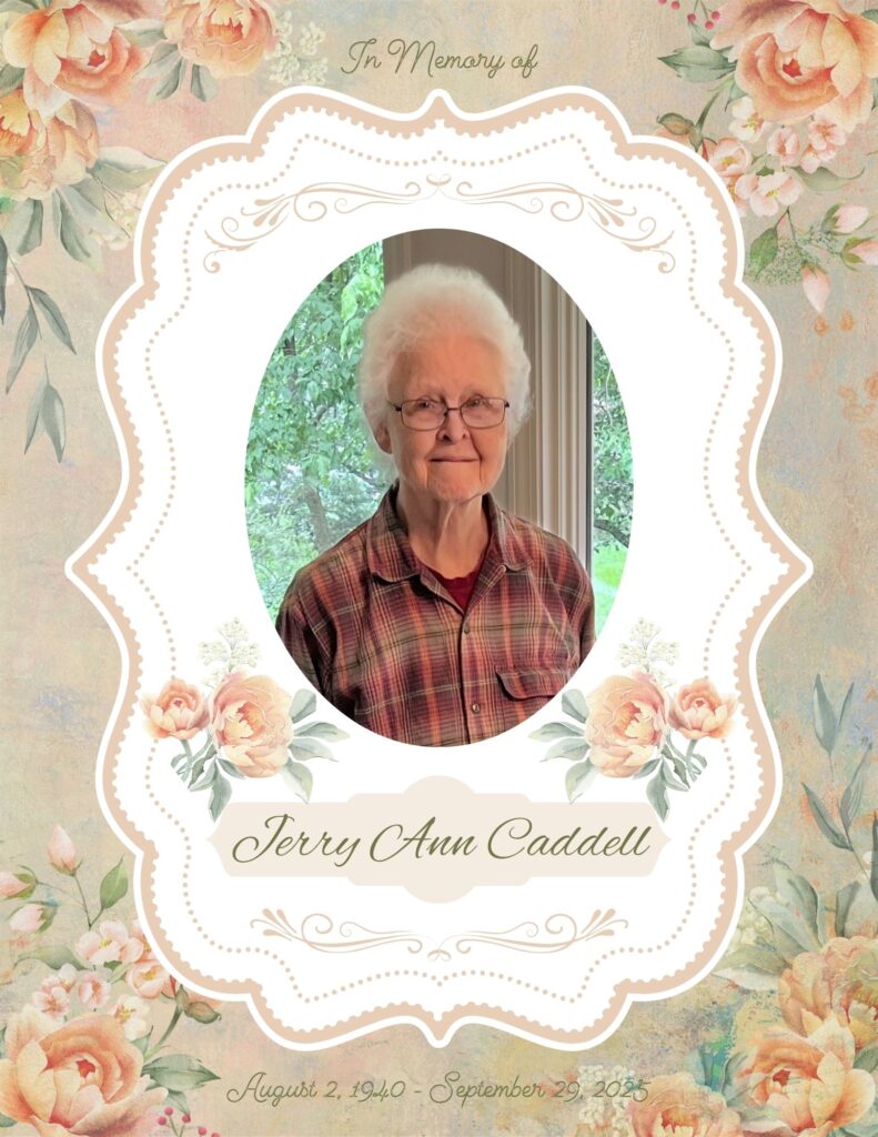 Jerry Ann Caddell, 85, of Blue Springs, Missouri, passed away peacefully on Monday, September 29, 2025. She was born August 2, 1940, the daughter of James and Nellene Ranstead, in Miami, Oklahoma.