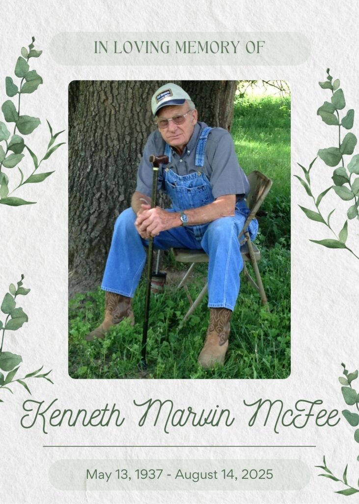 Kenneth Marvin McFee of Kansas City, Kansas was born on May 13, 1937 and went to sleep in Jesus on August 14, 2025. He was survived by his son, Dr. Steven McFee and his wife Linda, daughter Stephanie Zacharias and her husband Mickey and their 5 grandchildren, Matthew, Gracie, Quinn, Jonathan, and Annie. He was preceded in death by his wife, Naomi Ruth McFee, and parents, George and Hattie Belle McFee.