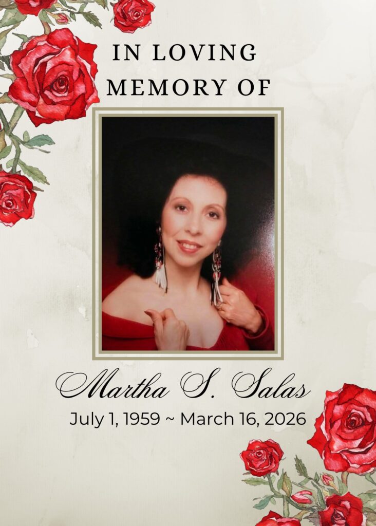 Martha S. Salas passed away peacefully on March 16, 2026, surrounded by the love of her family. She was born on July 1, 1959, in Chihuahua, Mexico, to Pablo and Evangelina Delgado.
