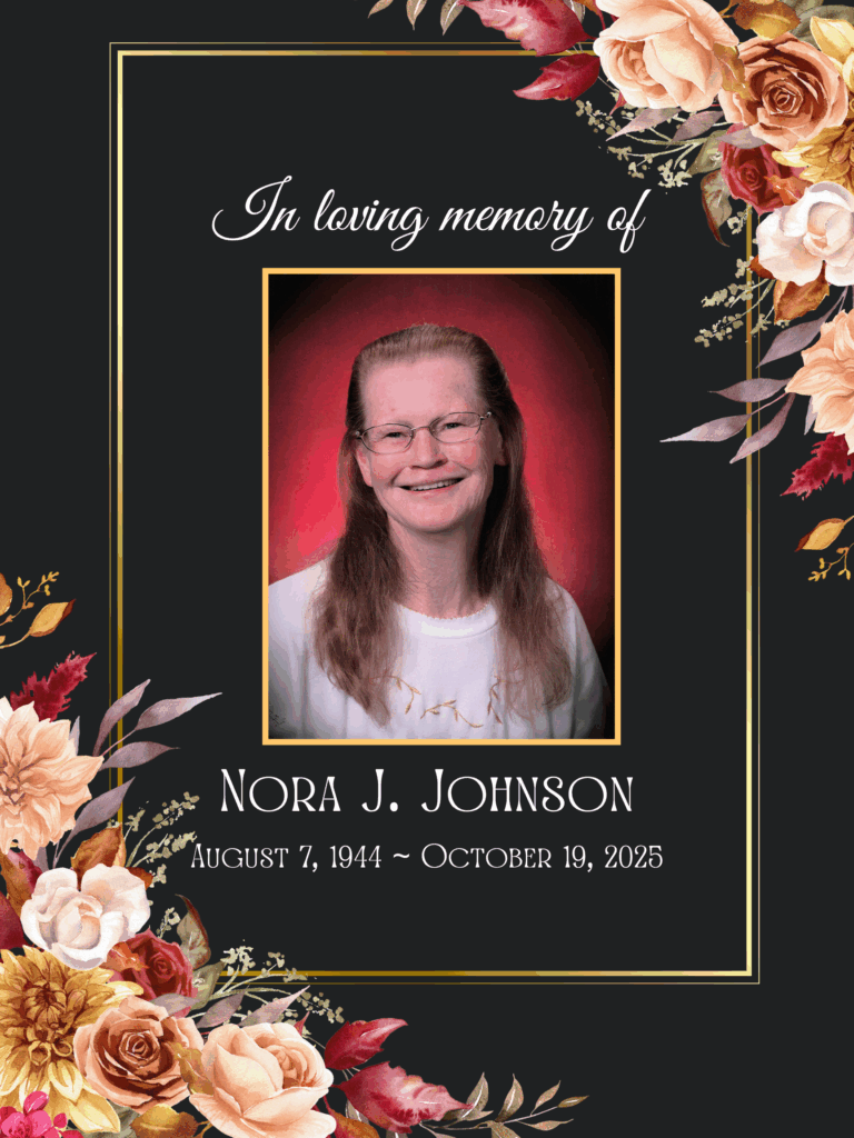 Nora Jane Johnson, 81, of Independence, Missouri passed away at her home on Sunday, October 19, 2025. Funeral services will be held at 11:00 a.m. Friday, October 24, 2025 at Royer’s New Salem Funeral Home, Independence, Missouri; burial following in New Salem Cemetery, Independence, Missouri.  The family will receive friends from 10:00 a.m. until service time at the funeral home.