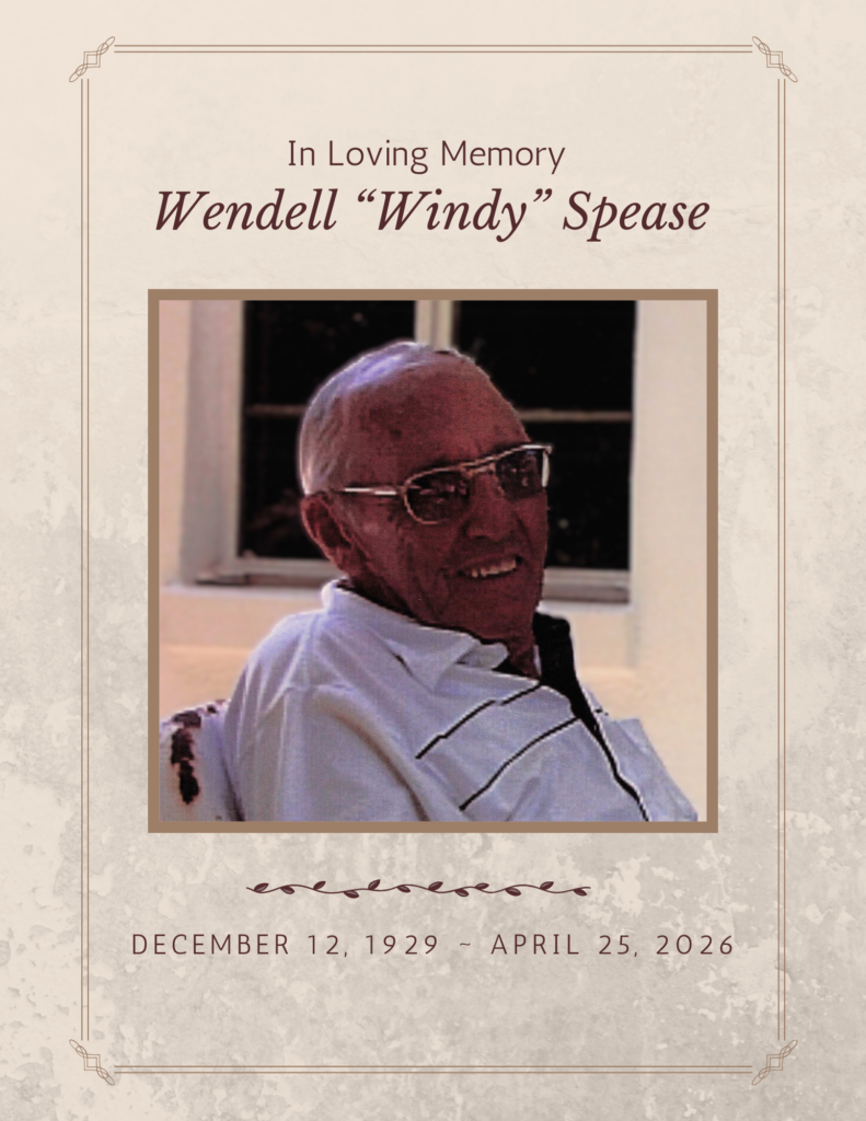 Wendell (Windy) Spease, a cherished father, grandfather, and friend, passed away on April 25th, 2026, at the age of 96.