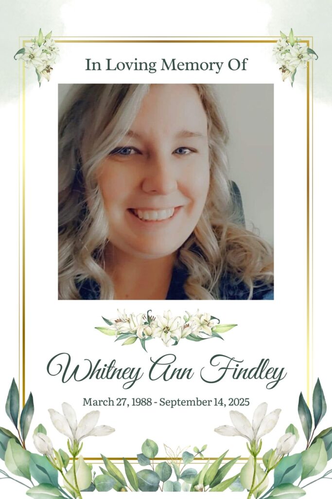Whitney Ann Findley, 37, of Oak Grove Missouri unexpectedly passed away September 14th, 2025, at Centerpoint Medical Center in Independence, MO. Visitation will be on Wednesday, September 24th from 12:00pm to 2:00pm with the memorial service starting at 2:00pm at Royer Funeral Home in Oak Grove. In lieu of flowers, contributions may be made to The Celiac Disease Foundation or the National MS Society.